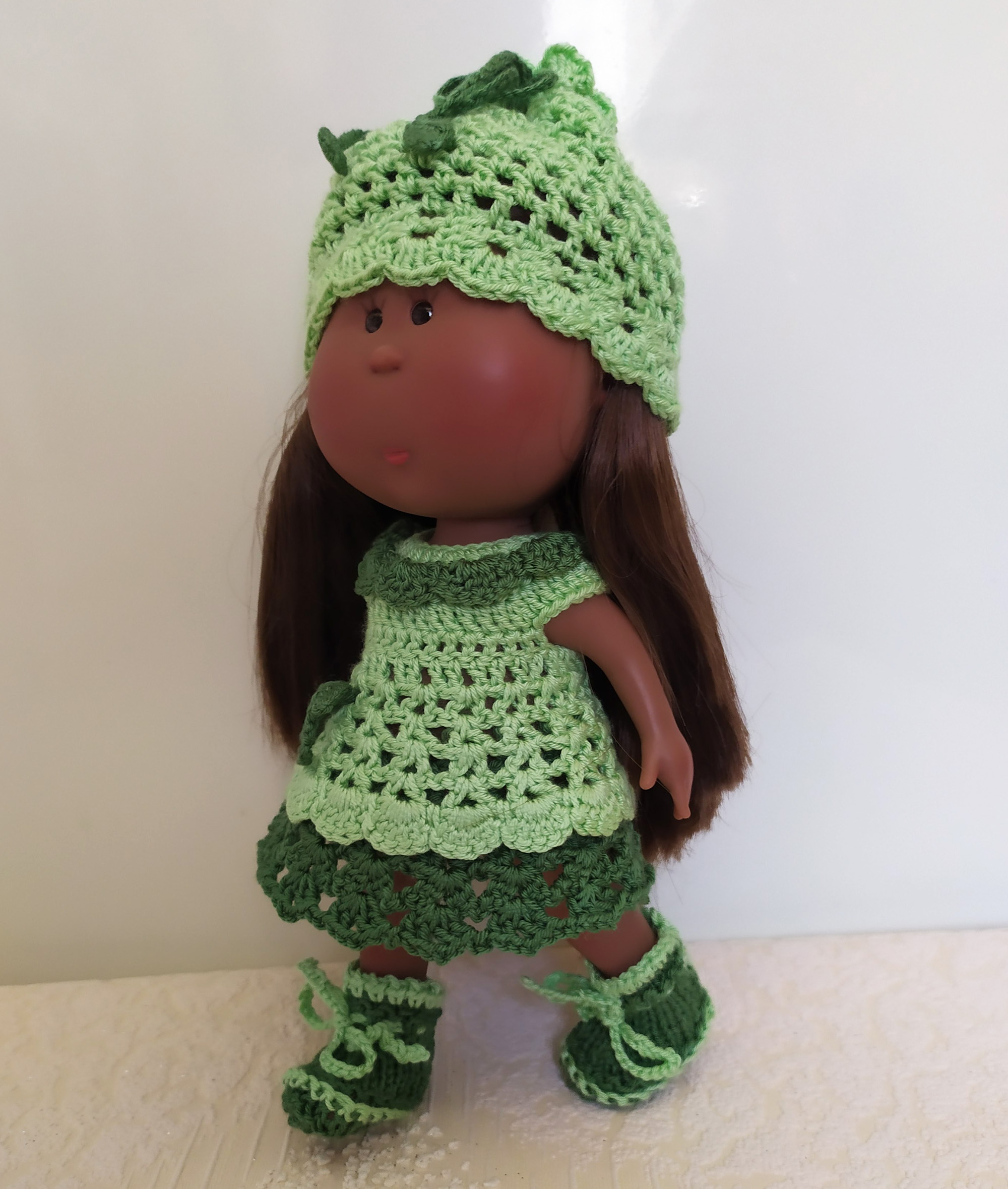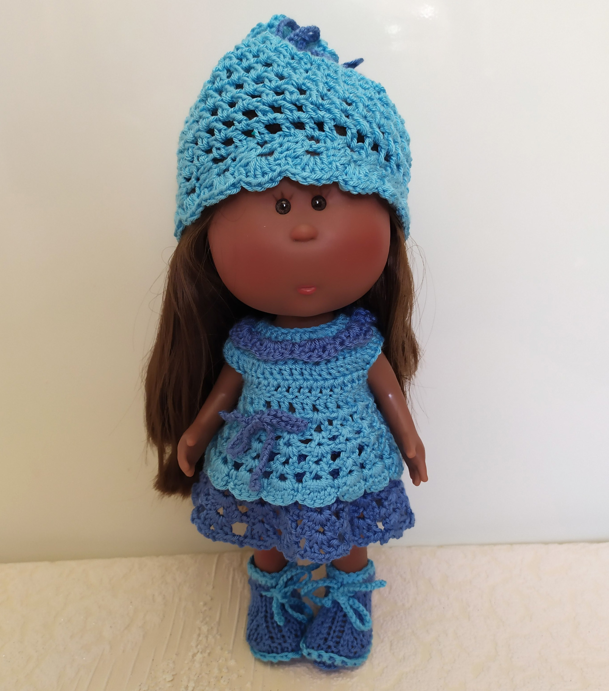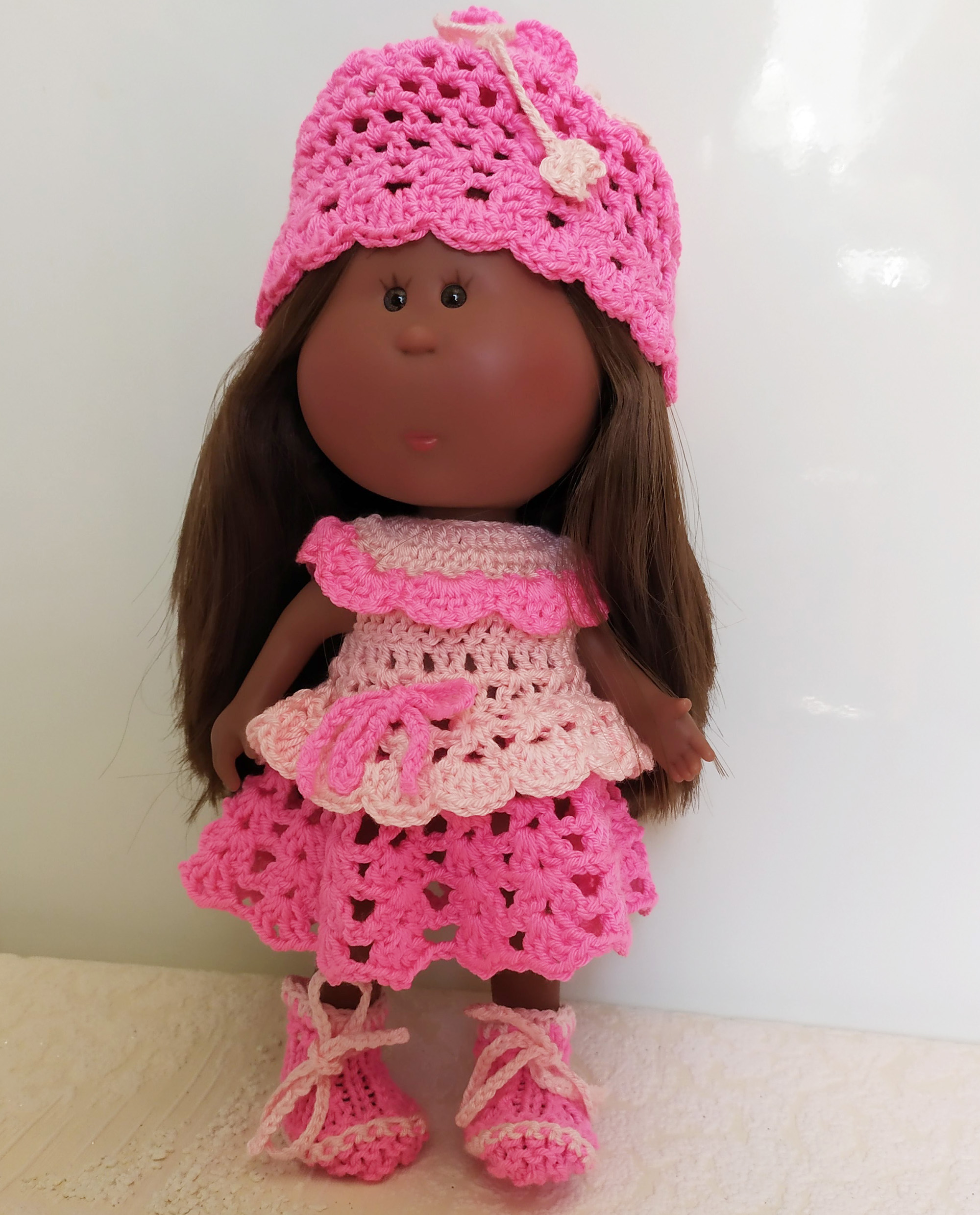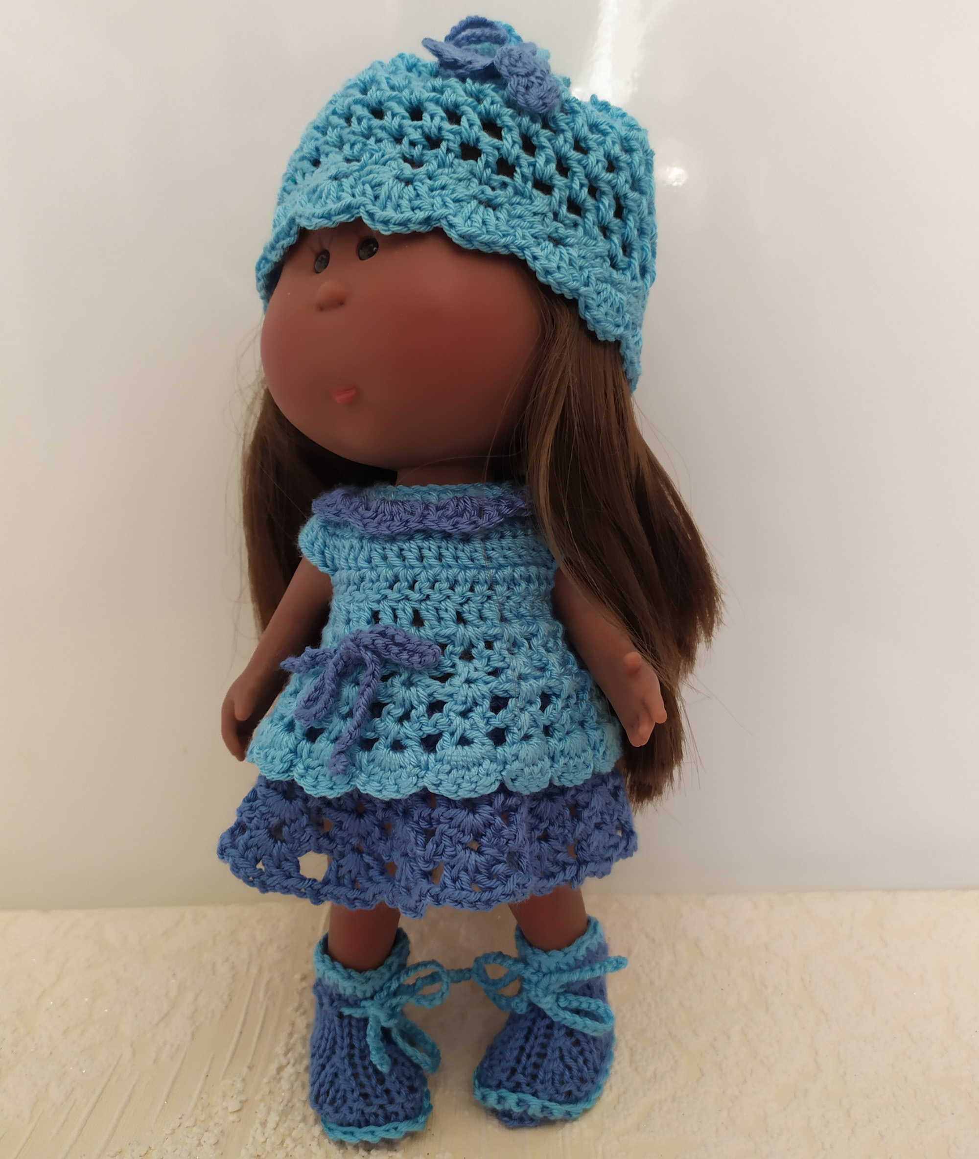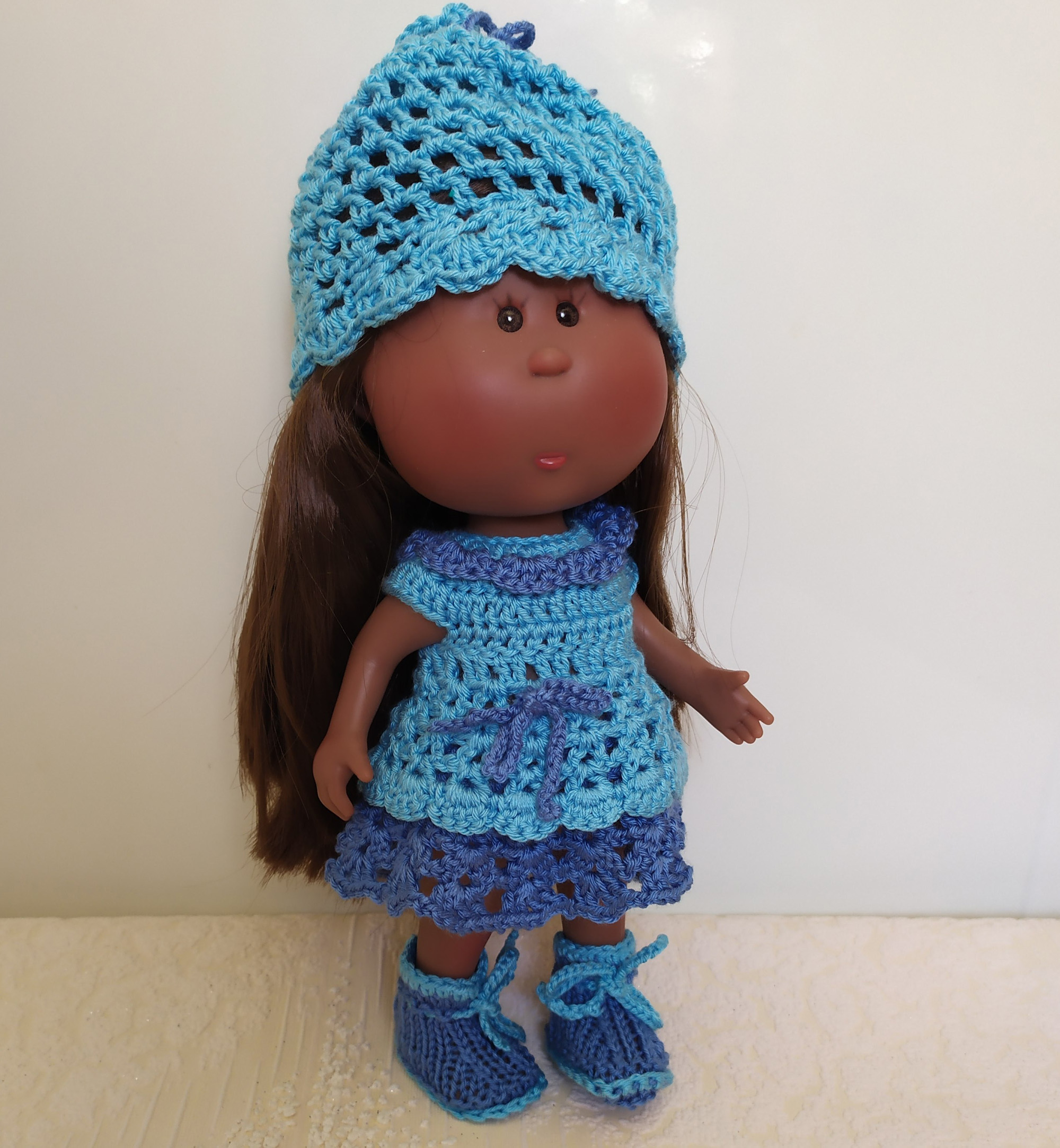 This handmade adorable 3-item set (Dress, Hat, Boots) for Doll Little Mia Nines d'Onil 23cm / 9” made of soft acrylic yarn. The bright colors of this outfit are perfect for summer.