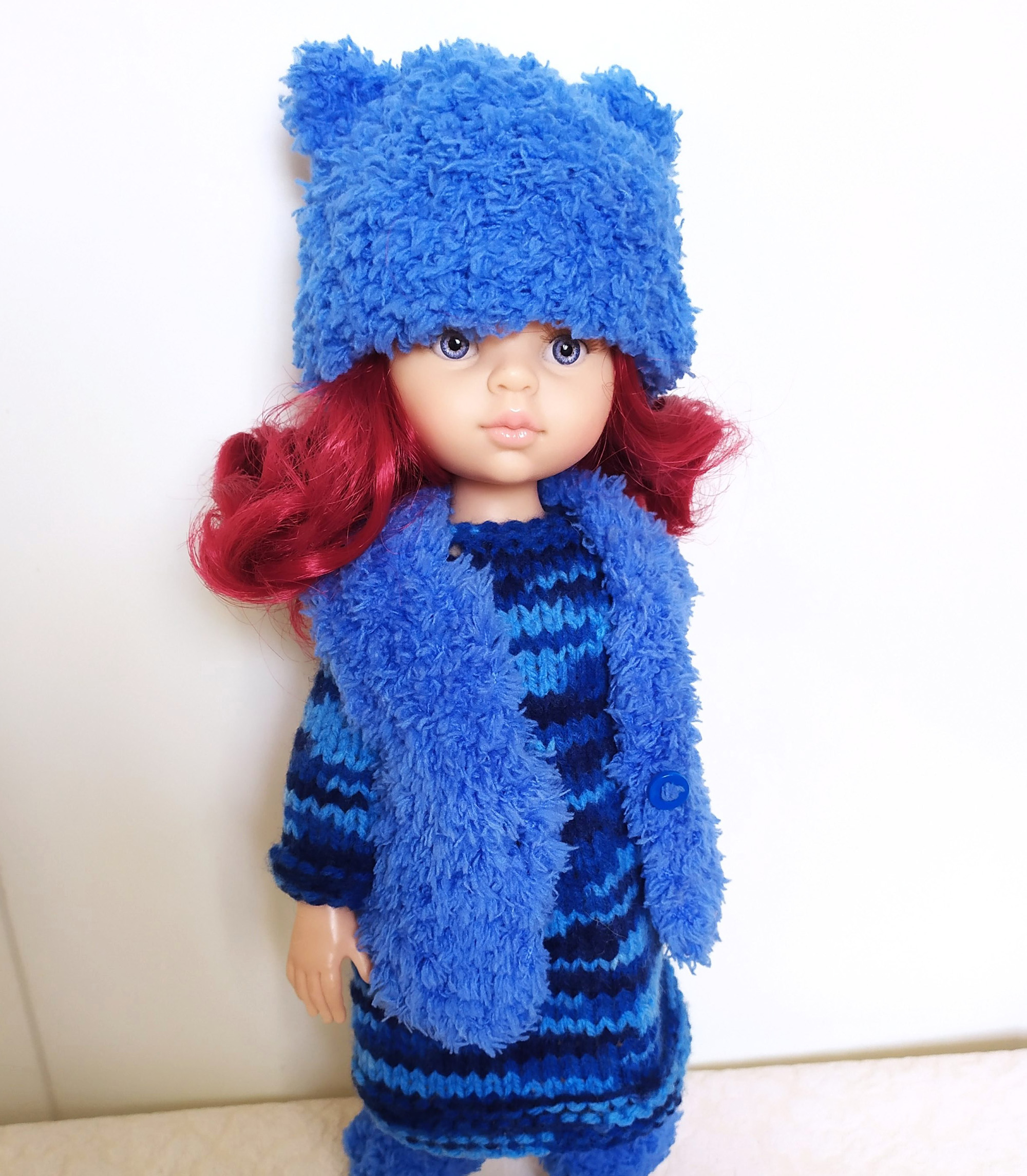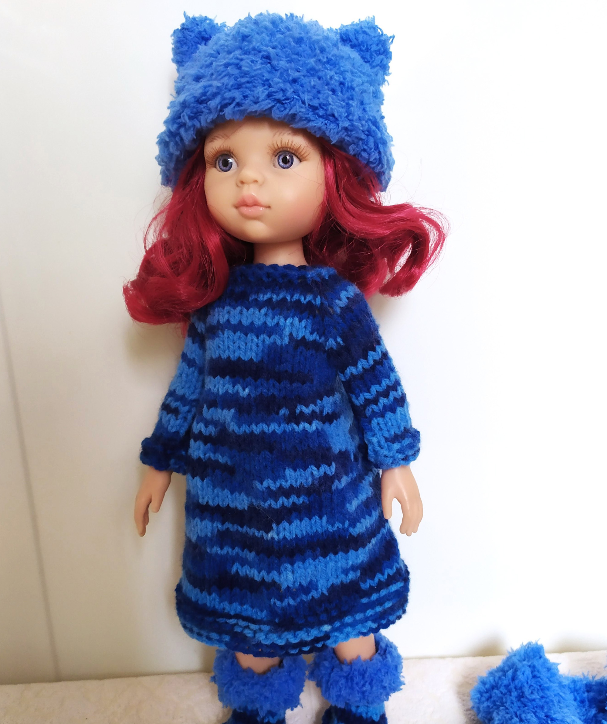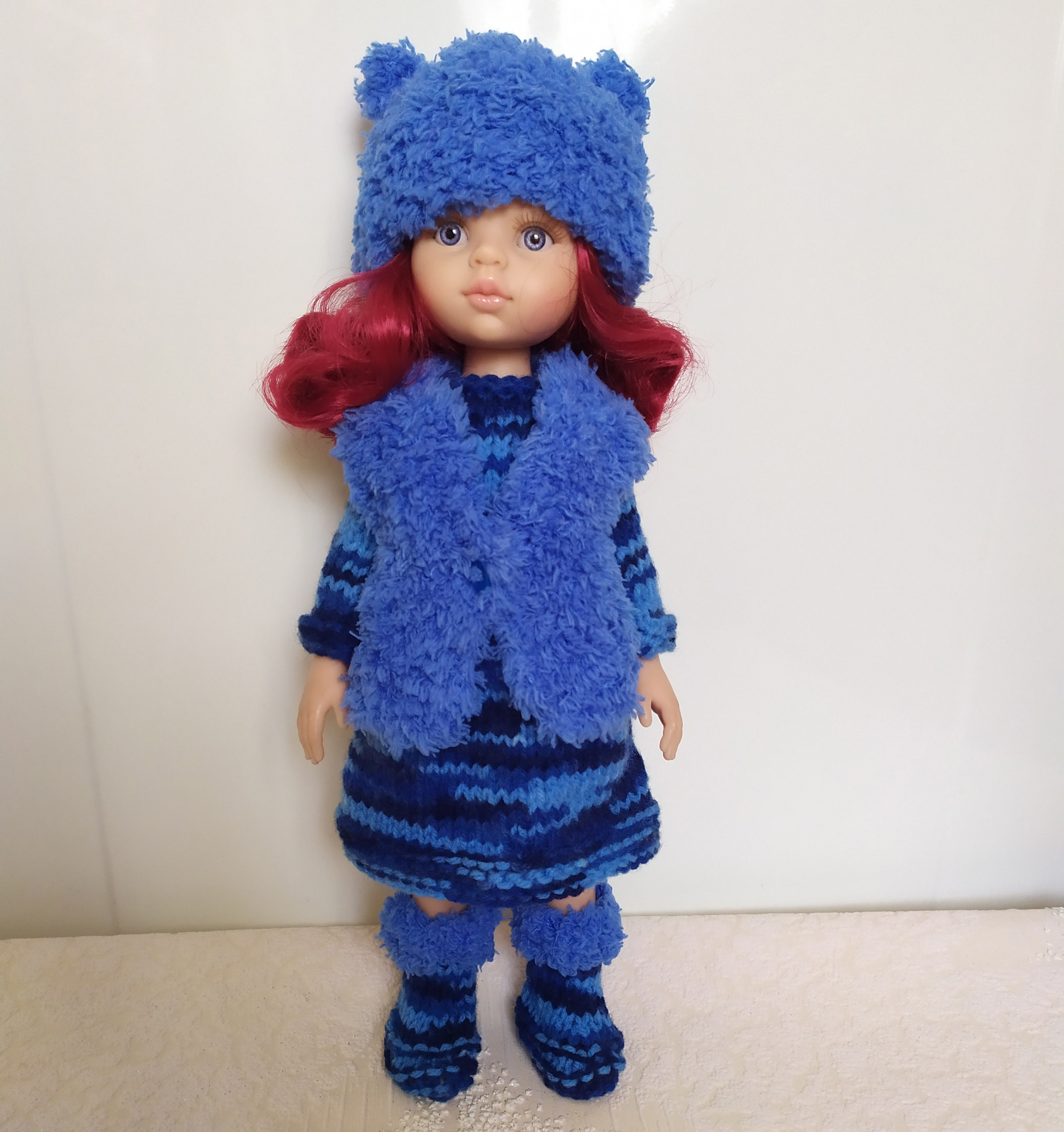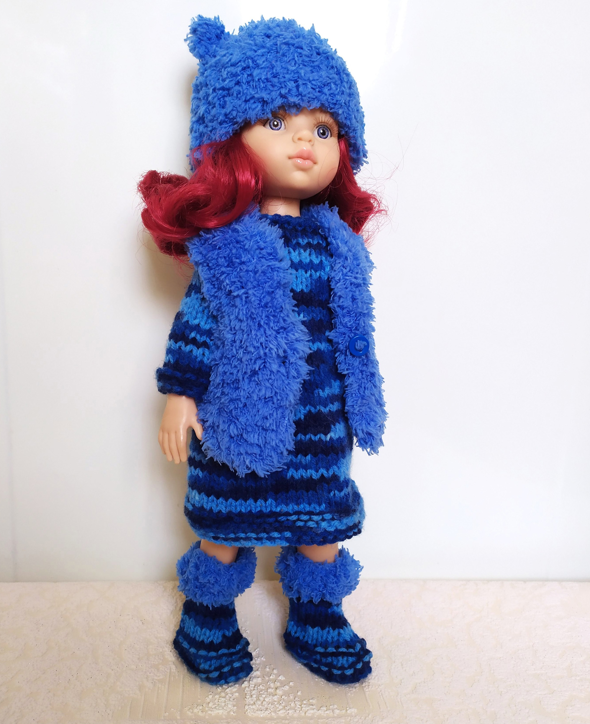 This handmade colorful bright doll outfit (Vest, dress, hat, boots) made of soft acrylic- wool blend yarn and fits 12-13 inch dolls (31-33 cm). Paola Reina, Ruby Red Siblies, Little Darling doll.