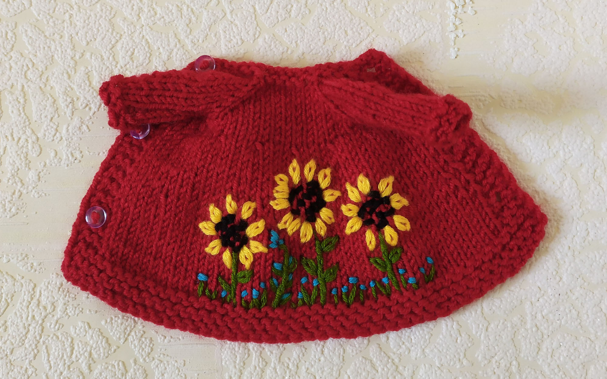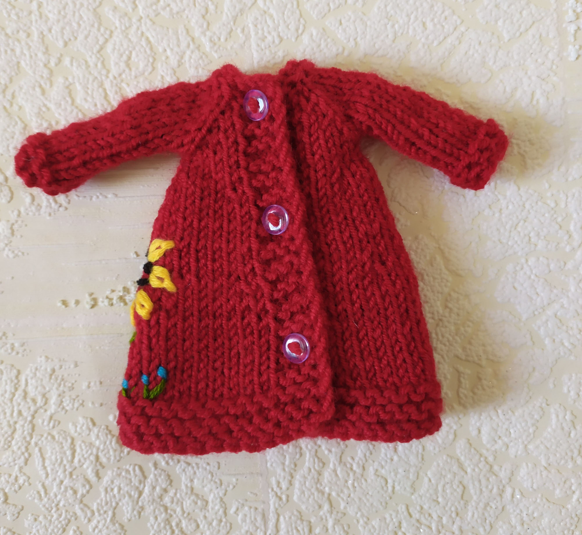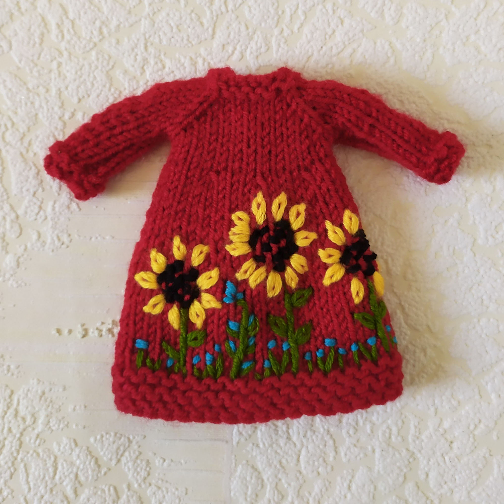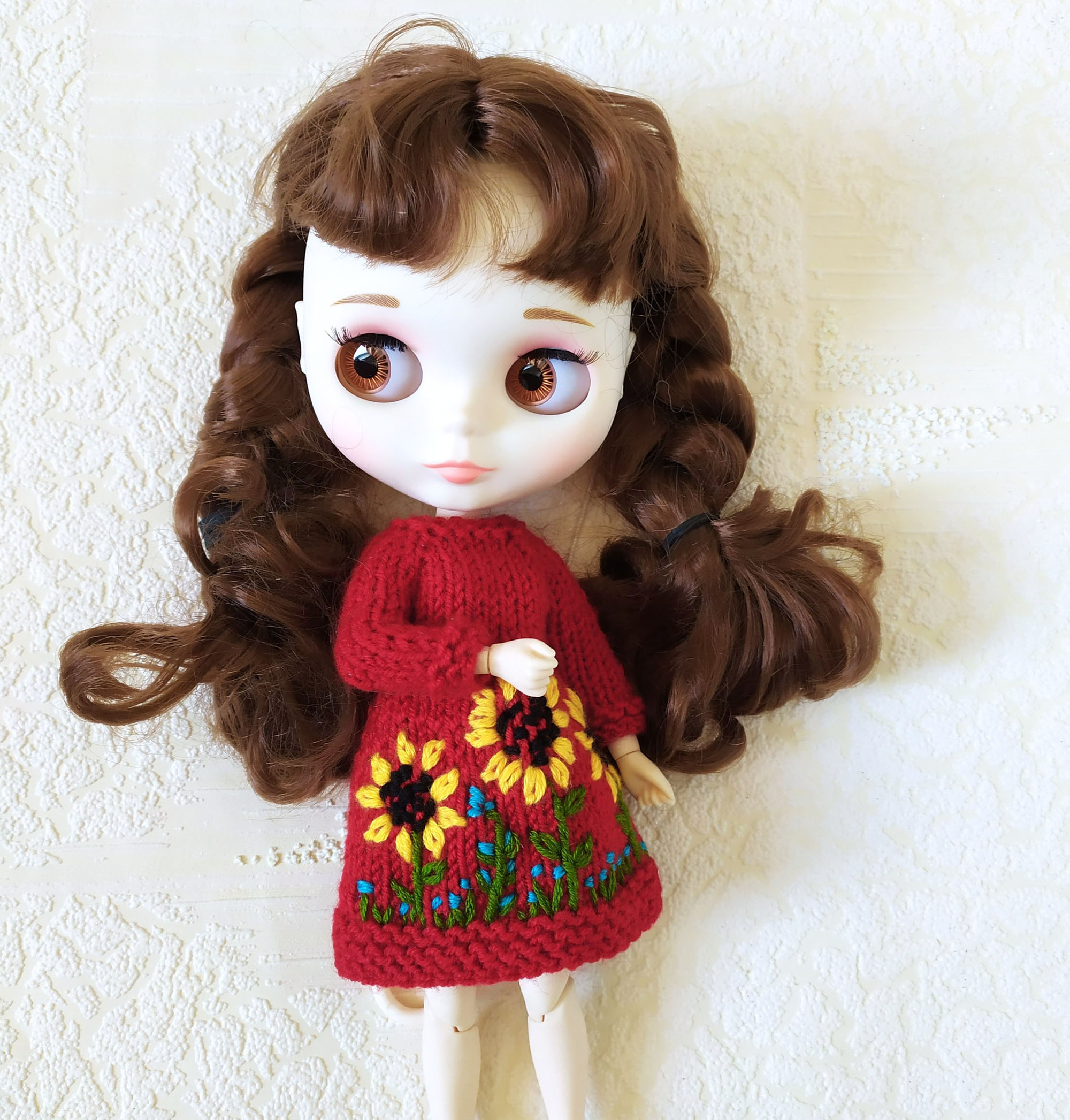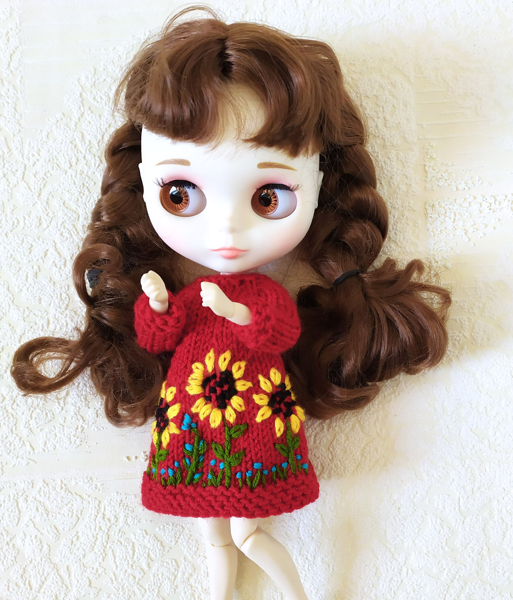 This handmade bright dress for doll Blythe made of soft acrylic-wool blend yarn. The dress is decorated with hand-embroidered sunflowers.