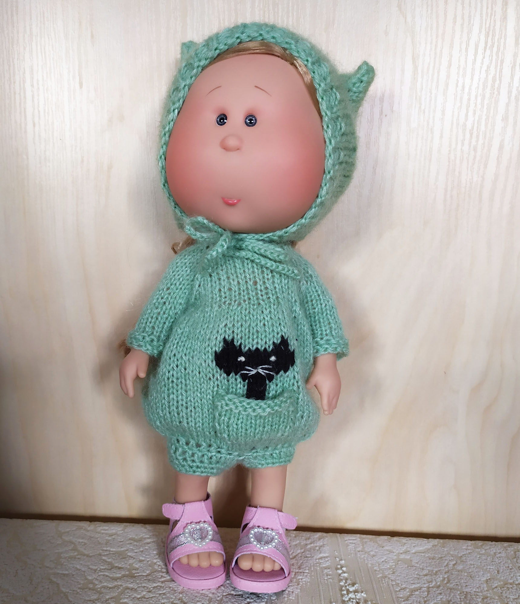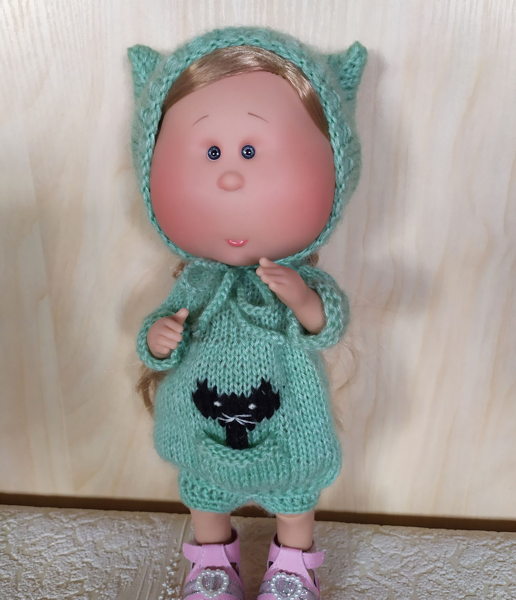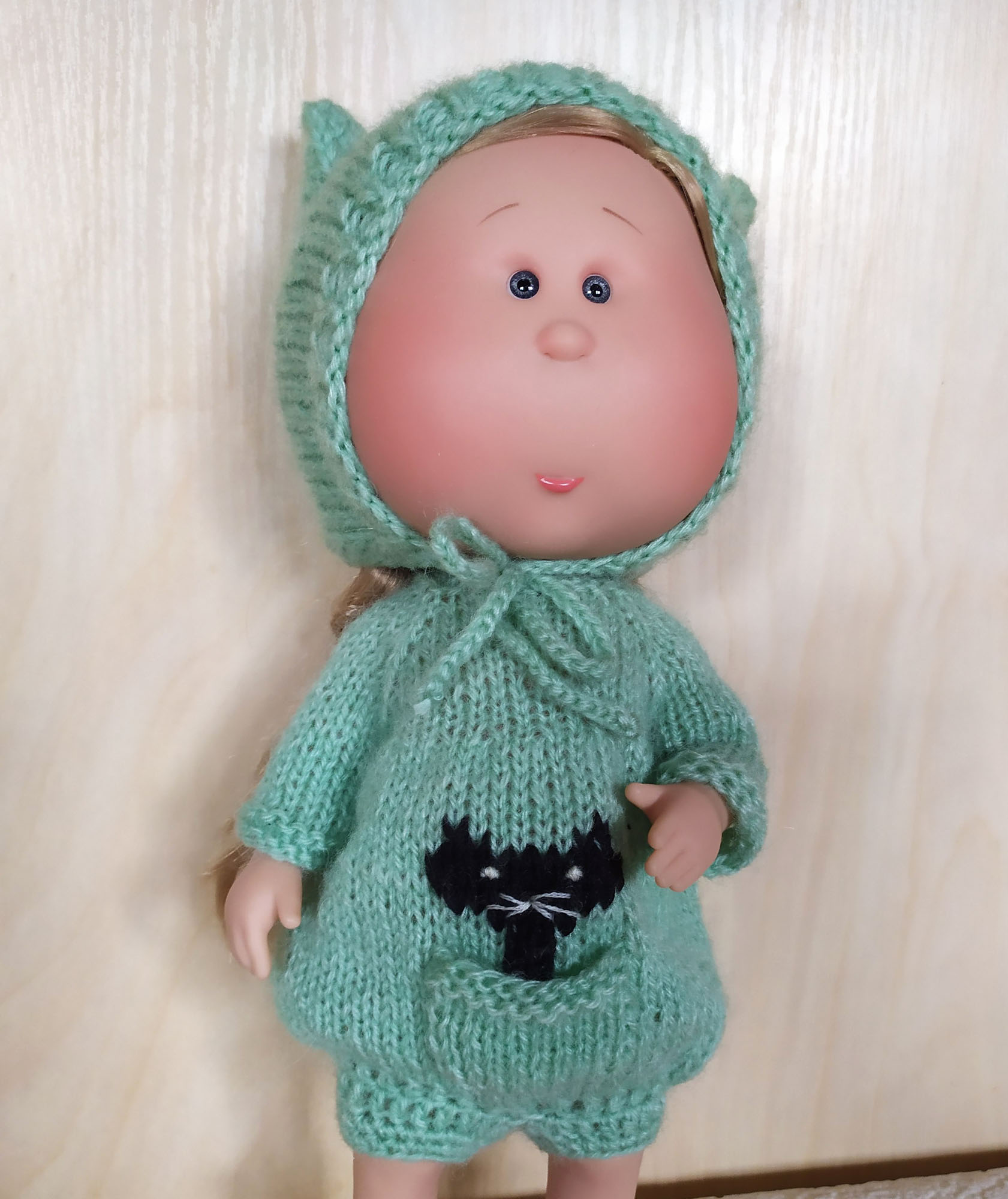 This handmade adorable outfit (romper with black cat in small pocket and hat with cat ears) for Doll Mia Nines d'Onil 30cm /12” made of soft acrylic-wool blend yarn.